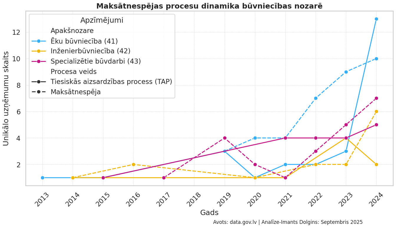 Būvniecības nozares maksātnespējas procesu dinamika pa apakšnozarēm un veidiem