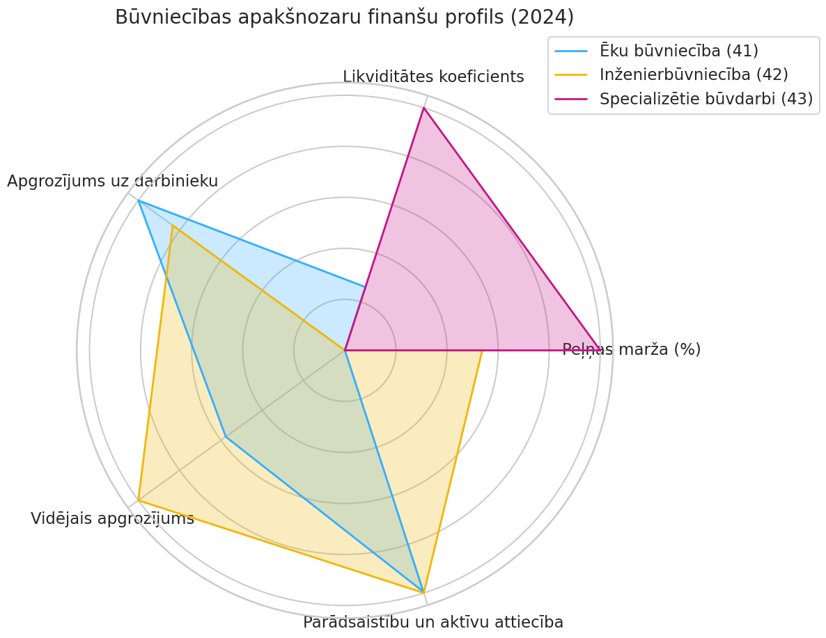 Radara diagramma vizuāli salīdzina trīs galveno būvniecības apakšnozaru finanšu “profilus” 2024. gadā, skaidri izceļot to atšķirīgos biznesa modeļus: