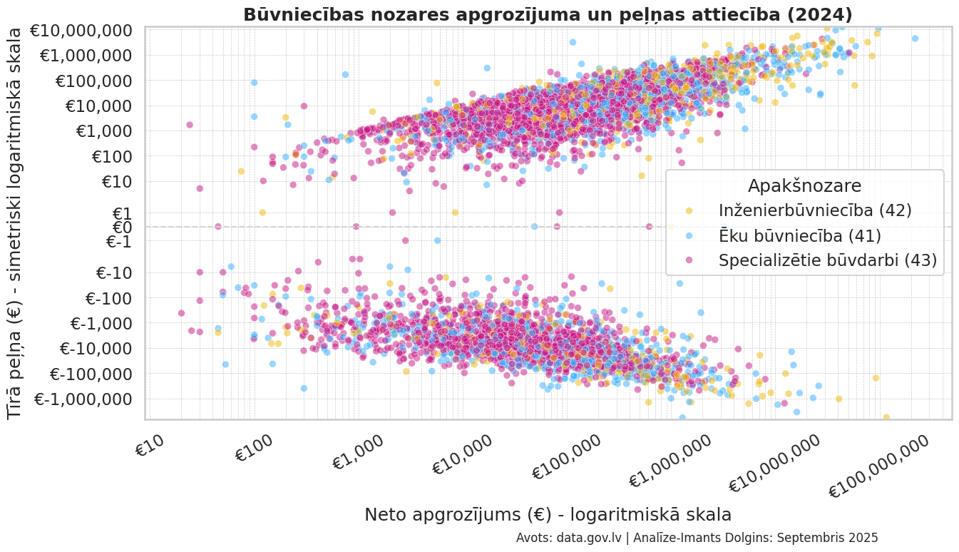 🛠️ Specializēto darbu stabilitāte: Pretstatā tam, Specializētie būvdarbi (43) demonstrē stabilāku peļņas tendenci. Lai gan arī šo jomu ietekmē ekonomiskie cikli, tā ir spējusi izvairīties no tik krasām lejupslīdēm kā pārējās divas apakšnozares, kas liecina par noturīgāku biznesa modeli.